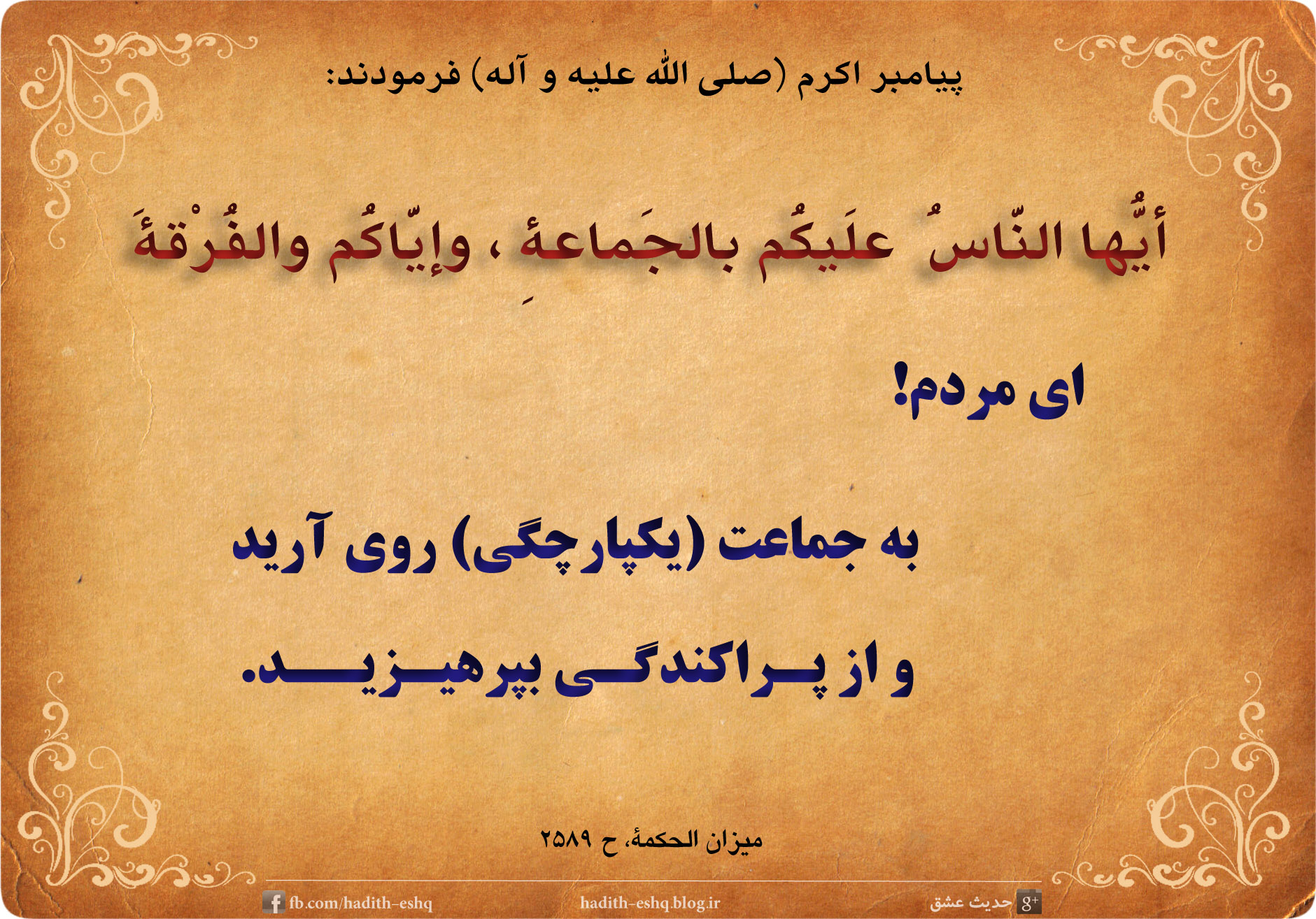 اى مردم! به جماعت (یکپارچگى) روى آرید و از پراکندگى بپرهیزید.