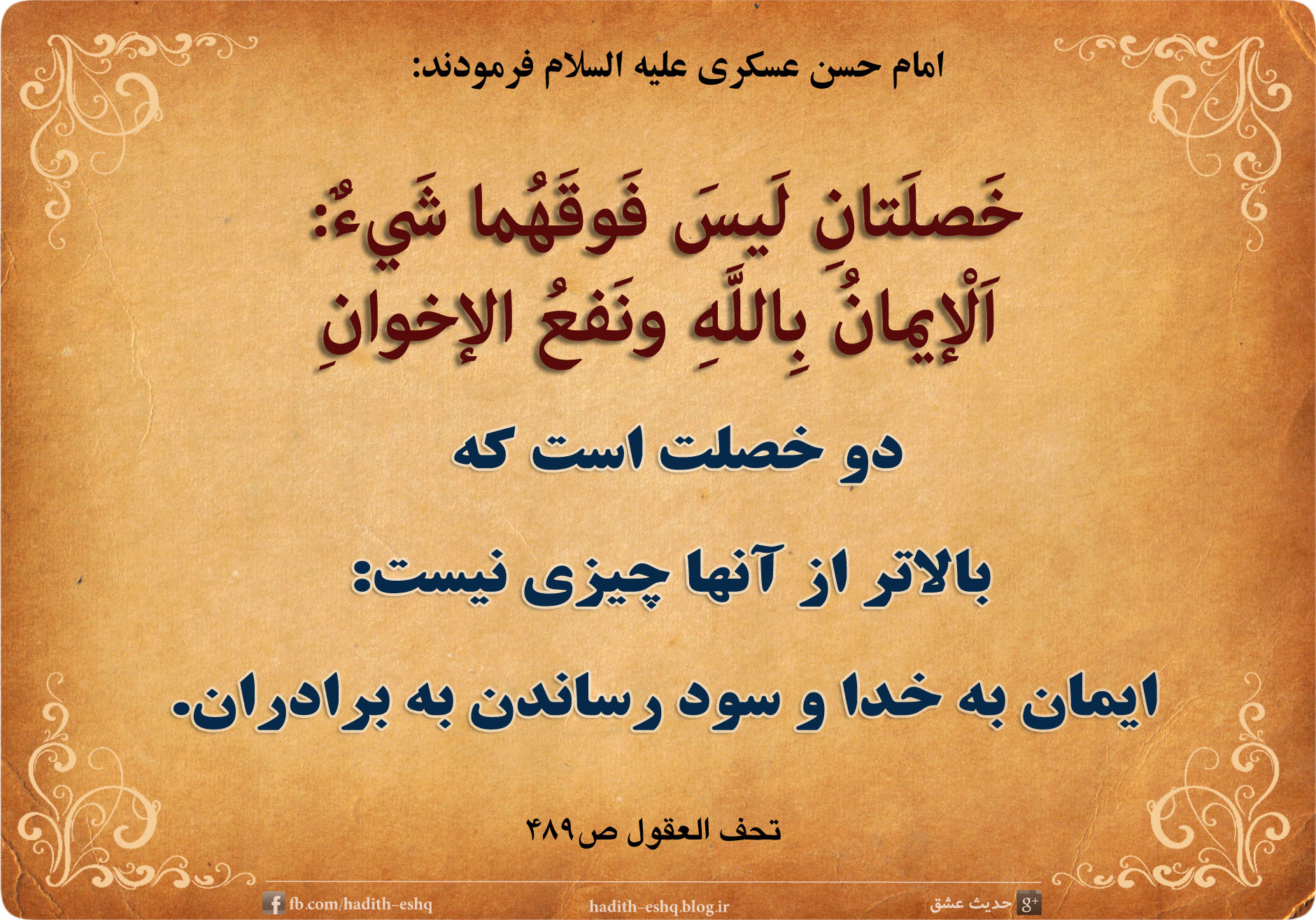 خَصْلَتانِ لَیْسَ فَوْقَهُما شَیءٌ: الاْیمانُ بِاللهِ، وَنَفْعُ الاْخْوانِ.