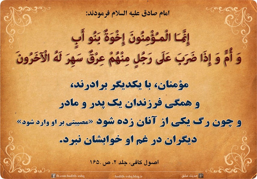 مؤمنان، با یکدیگر برادرند، و همگی فرزندان یک پدر و مادر و چون رگ یکی از آنان زده شود «مصیبتی بر او وارد شود» دیگران در غم او خوابشان نبرد.